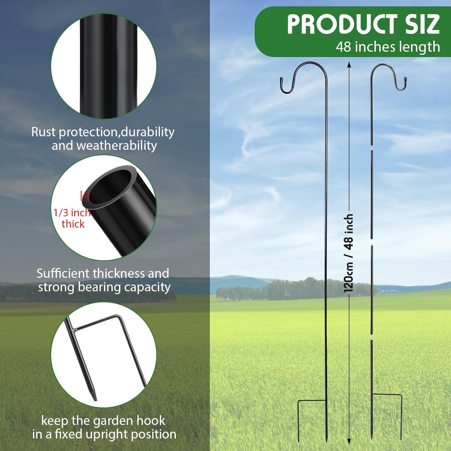 Feature: Each garden pole takes up very little space, just a little open space on the ground, and the rest is the area in the air, allowing the entire ground to accommodate more things and look more beautiful. These hooks are very easy to remove, and these hooks are easy to carry and move around your garden. Our shepherds hooks are suitable for outdoor space, with the ability to hang bird feeders, hummingbird feeders, wind chimes, solar lanterns, and more. These heavy duty hooks are also suitable for hanging plant containers, flowerpots, and outdoor lights, making it an essential accessory for your garden, yard, or patio. Specifications: Material: iron Color: black Size: about 47.24 inches Package include: 12 x Shepherd hooks Please allow slight size error due to manual measurement. The colors may exist slight difference due to different screen.