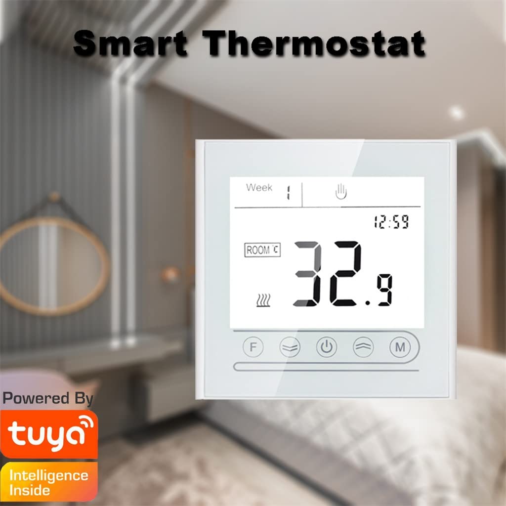 Power Supply: 95~240VAC, 50~60HZLoad Current: 16A (GB)/ 3A (GA,GC)Color: whiteDisplay: touch screenDisplay accuracy:±0.5℃Sensor: NTCSet temperature range: 5~60℃ (max 70℃)Ambient temperature: 0~95℃<;1wRunning program: Set per 1 week as a cycle( 5+2 or 6+1 or 7)Wire Terminals: Wire 2* 1.5mm2 or 1* 2.5mm2Size: 86* 86*41mmProtection Class: IP20Shell material: PC+ABS (flame retardant)Features:1. Memorize all your after sudden power-off. When power is on again, you do not need to reset it.2. Support 5+2 /6+1 / 7 days Weekly Programmable, six periods programmable controlling temperature setting.3. support, APP Remote control by mobile phone. mobile phone can control device and also can control multiple devices.4. manual or automatic function,With voice control function, compatible with Alexa and Home.5. Backlight brightness can be adjusted through the APP.6.Touching keys, tempered glass surface, full screen display.7.The on-off key has night light indication.8.low temperature antifreeze protection.Note:Due to the different monitor and light effect, the actual color of the item might be slightly different from the color shown on the pictures. Thank you!Please allow 1-2mm measuring deviation due to manual measurement.Quantity : 1 pcsHolding the handle is also very convenient, leaving no pain or marks.