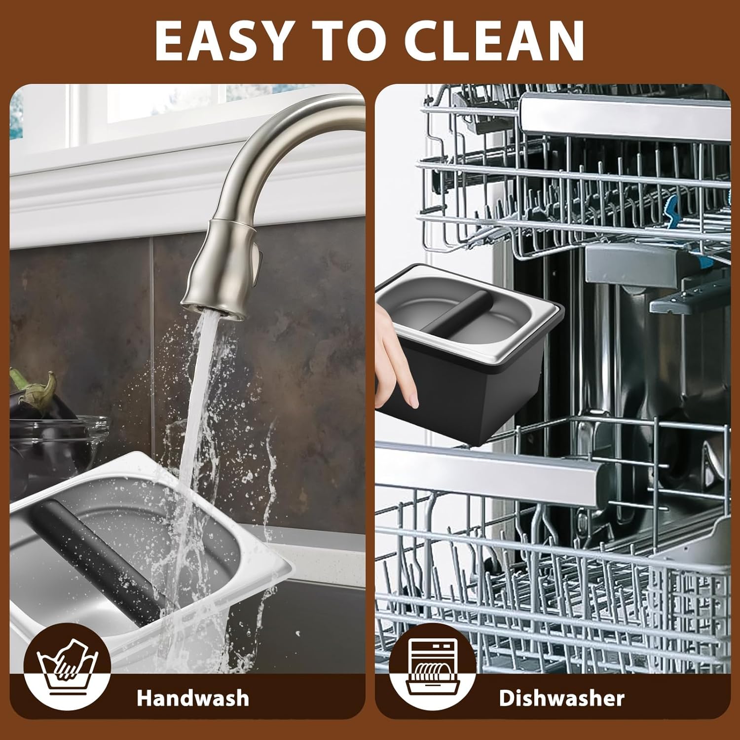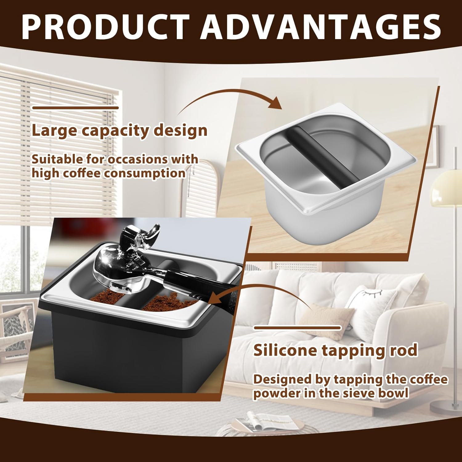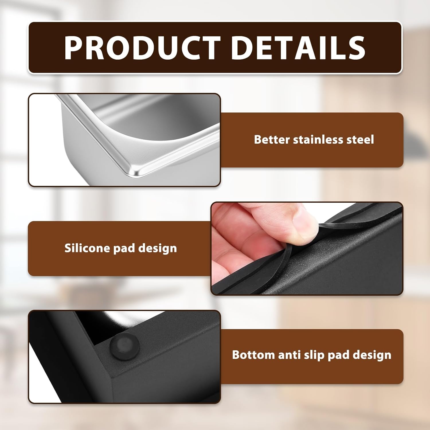 Parts List:1 x Coffee Knock BoxProduct Specification:DescriptionThis coffee knock box is a remarkable product for coffee lovers and professionals in the coffee industry. It combines the advantages of stainless steel material, large capacity, and user friendly features, making it a valuable addition to any coffee setup.Key FeatureStainless Steel Material: The use of stainless steel ensures that the coffee knock box can withstand the rigors of daily use, whether in a busy commercial cafe or a home kitchen.Specification:Product Name: Coffee Knock BoxMaterial: Stainless SteelSize(optional):Small: 18.6x17.3x10.8cm/7.32x6.81x4.25inchLarge: 27.2x17.3x10.8cm/10.71x6.81x4.25inchNote:1. There may be slight differences between the picture and the actual color of the commodity. We will try our best to show you the exact color2. Please allow slight dimension differences due to manual measurement