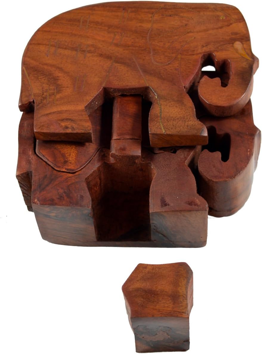 deceptively simple looking puzzle in the shape of an Elephant, which opens only after the puzzle is solved, crafted in polished Sheesham wood and brass inlay to engage your grey cells and pose a light hearted challenge at any soiree.