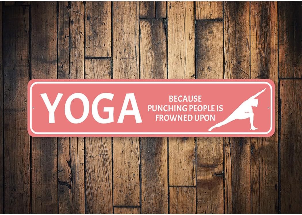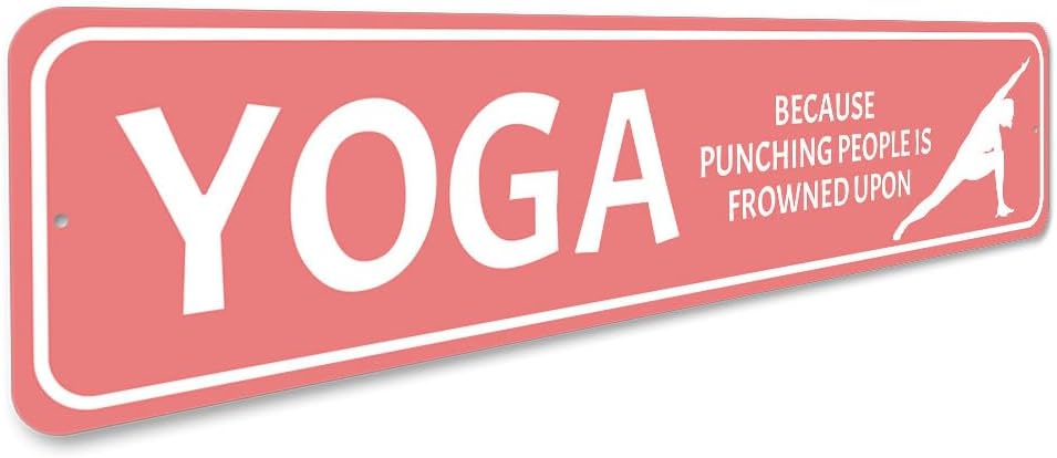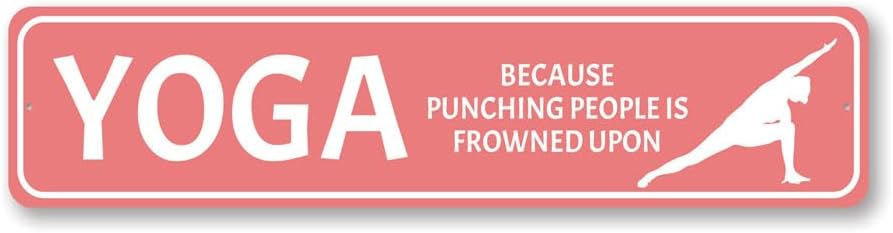 SKU:5402-Yoga Because Punching Is Frowned Upon Sign - 6 x 24Complete your home decor with our unique signs, or give as a family gift to friends! Our novelty signs are an excellent choice for wall decor, made of rustproof, Sturdy Aluminum.All of our street signs are made of Premium Materials, purchased within the USA. The sign itself is made of aluminum and will never rust providing years of enjoyment indoors and outdoors. No Cheap plastic!Conveniently placed pre-drilled Holes for easy mounting, which gives you more time to remodel your Pub, Man Cave, Bathroom, Home, Store, Garage or even your yard!All of our concepts, processes and designs are proudly Made in the United States, in our shop in the heartland of the USA, in Lizton, Indiana.The Lizton Sign Shop is a family ran and operated business. We enjoy what we do and feel it shows in the finished result. We look forward to serving you and enjoy the relationships we have created over the years with all of our customers. Click "Add to Cart" to grab this sign now! All content and designs are subject to copyright and may not be reproduced in any form. Goods & Services 2002-Present The Lizton Sign Shop
