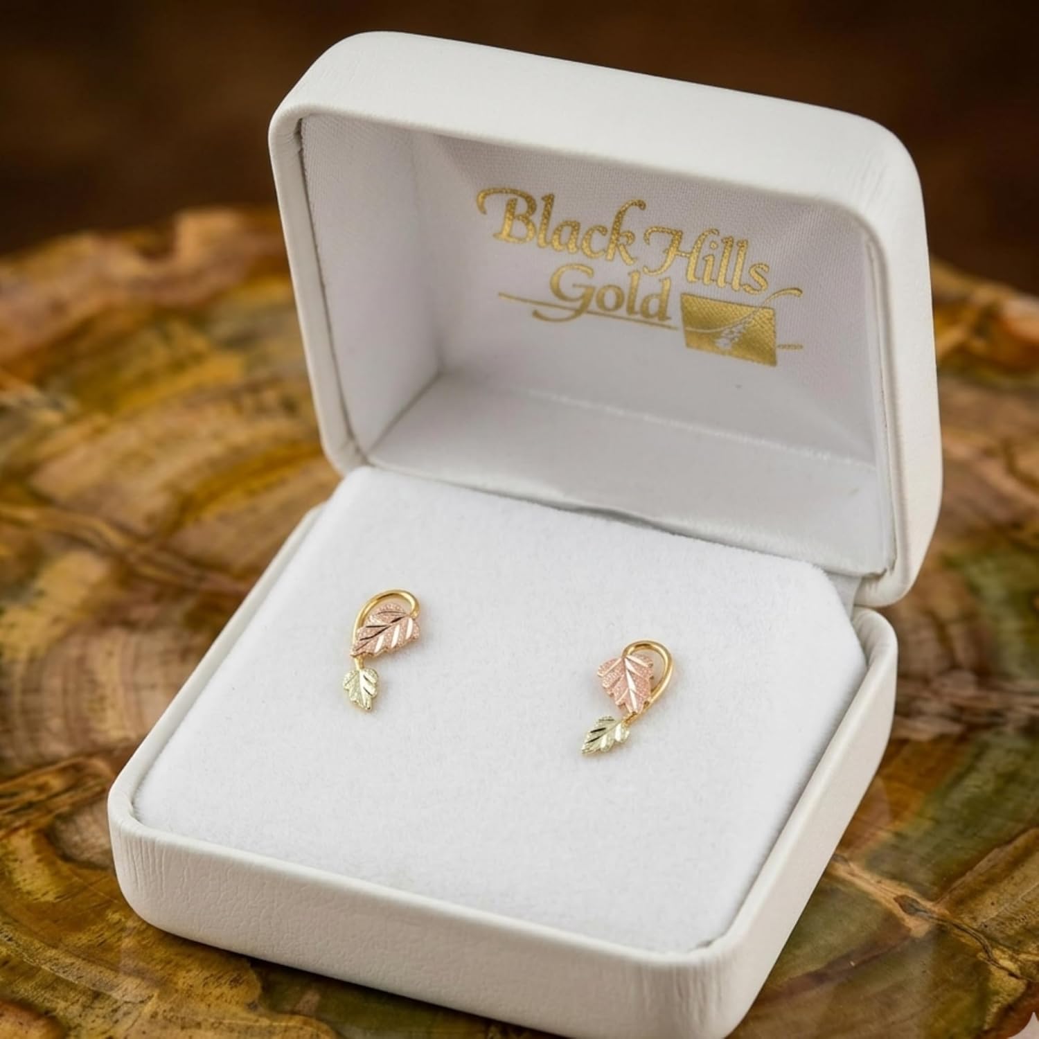 Legend has it: Good Luck Comes to All Who Wear Black Hills Gold JewelryImpress your loved one with this elegant earrings are Created in 10k gold, this pretty earrings features 12k gold pink and green leaves. These earrings have post backs. The beautiful leaf symbolizes roots, nature, healing, rebirth and life. It can also represent turning over a new leaf representing a job promotion or change in one's life, putting down roots and/or creating long-lasting relationships; whether it is family, friendship, a working relationship or the love of your life. Whether you treat yourself or gift them to someone special, they are a thoughtful, unique keepsake. Quickly becoming her favorite go-to fashion accessory; they’re perfect for any outfit. They contain no nickel and are gentle on sensitive skin.Legend has it that during the 1870s gold rush, French goldsmith Henri LeBeau got lost in South Dakota's Black Hills. Believing he was near death, he dreamt of a stream with grapevines. Awakening to find this exact scene, he gratefully dedicated his life to crafting jewelry inspired by grape clusters and leaves in rose, green, and yellow gold.Upon ordering, the jewelers in South Dakota start crafting your earrings. From the casting to the hand-placed, hand-engraved leaves, it is one of the most labor intensive styles of jewelry. Today, a series of up to 40 different steps are necessary to capture the same dramatic detail in the traditional and contemporary Black Hills Gold designs.The rising price of gold makes this, quite simply, a great investment.Footnotes: Signature Ensures Safe DeliveryHand-Crafted, Made to Order Especially for YouImage has been Enlarged for Detail and May Appear Larger than the Actual Size; Check with Measurements to be Sure of SizeThank You for Your Consideration, We Appreciate You.Gorgeous is Always Fashionable... Never Trendy.