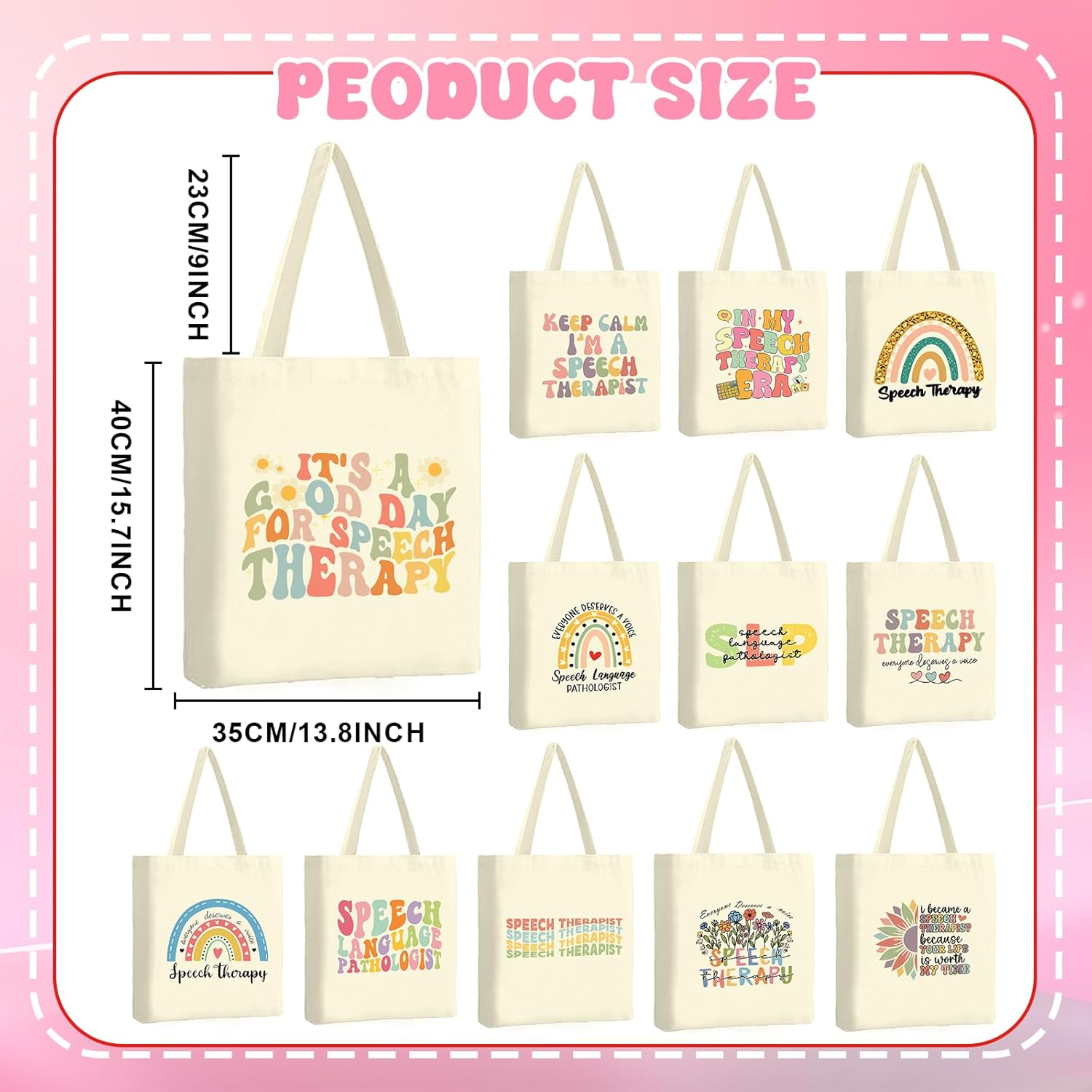 Celebrate and appreciate speech language pathologists with this 12 pcs SLP canvas tote bags set. Each bag measures 16 x 14 inches and comes in a unique style, making them both practical and stylish. Crafted from durable canvas material, these reusable tote bags are eco-friendly and perfect for everyday use—whether at school, the office, shopping trips, or travel. This set makes an ideal SLP gift bundle, suitable for Teacher Appreciation Week, holidays, graduation, or simply as a thoughtful present to show gratitude. With 12 different styles, there’s a design for every personality and occasion, ensuring these tote bags are not only functional but also meaningful keepsakes.