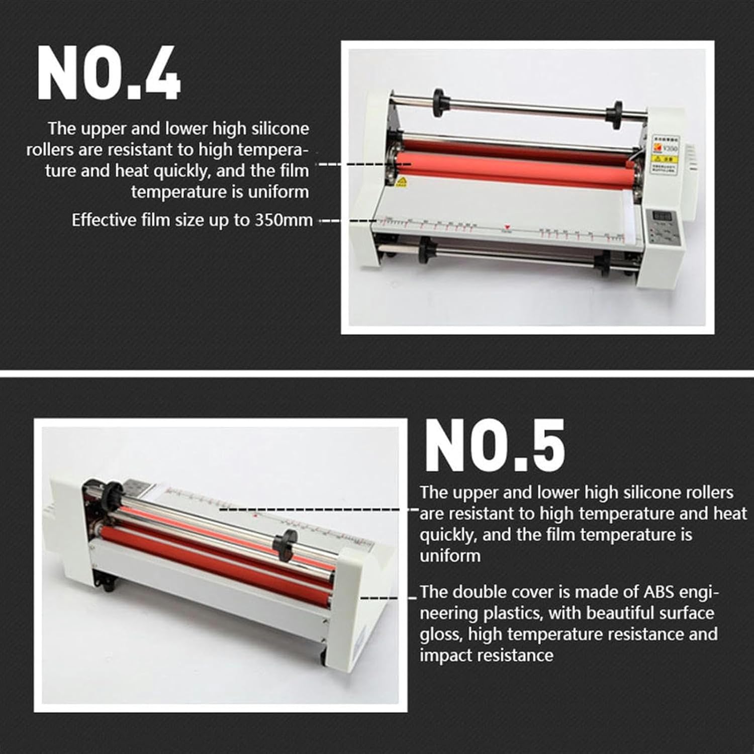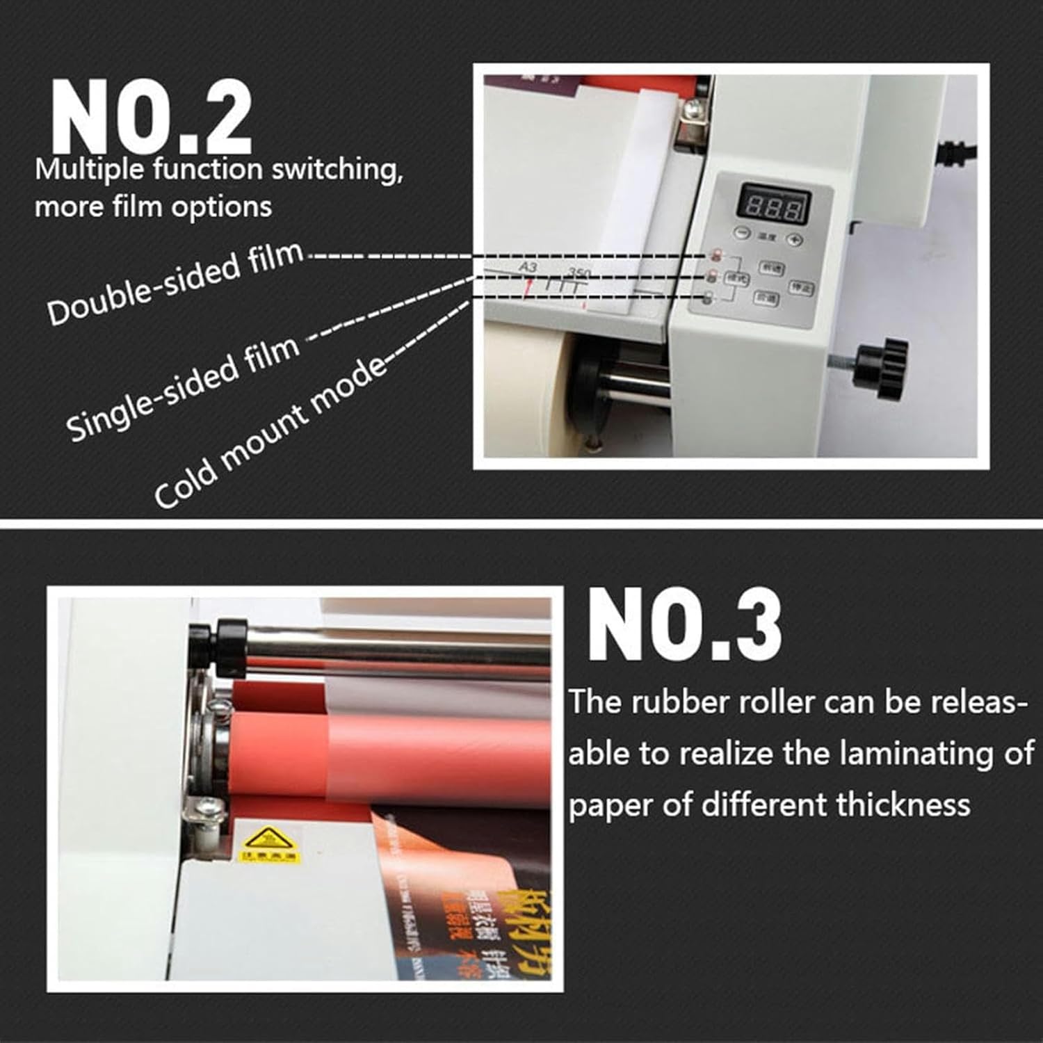 Product Specifications: Working power supply: 220V/50Hz Power consumption: ≤700W Film thickness: 0.1mm-5mm Film size: width 350mm, length can be customized Working temperature: 0°-140°C (cold table: room temperature, film 100-140°) Membrane core specification: 1 inch in diameter (254cm) Temperature control method: electronic temperature control, digital display Working method: cold lamination, single side lamination, double side lamination Machine size: 530*210*220mm Machine weight: 8KG (including packaging) Supporting materials: BOPP pre-coated film, PTE pre-coated film, DBW high-gloss film, high-grade cross pattern film Package includes: Laminating Machine*1