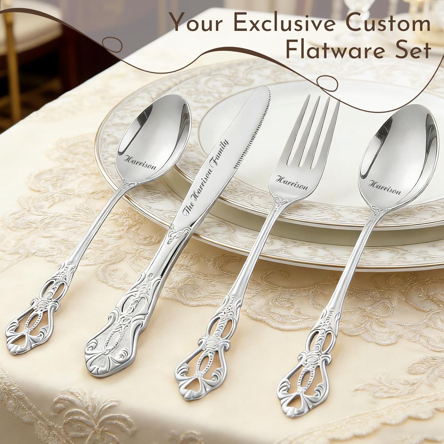 Elevate your dining experience with this exquisite 16-piece personalized silverware set, perfect for serving four people in style. Each piece is crafted from premium stainless steel and features an elegant vintage-inspired pattern with intricate decorative details along the handles. The set includes dinner forks, dinner spoons, and dinner knives, all enhanced with custom engraving options to add a personal touch. The mirror-polished finish creates a stunning reflection that adds sophistication to any table setting. These carefully designed utensils offer a comfortable grip and balanced weight, making them ideal for everyday use and special occasions alike. The timeless design makes this set a wonderful choice for wedding gifts, housewarmings, or as a treasured family heirloom. The durable stainless steel construction ensures lasting quality through countless meals and celebrations. Transform your dining table into a showcase of personalized elegance with this versatile flatware set that seamlessly combines classic charm with modern functionality.