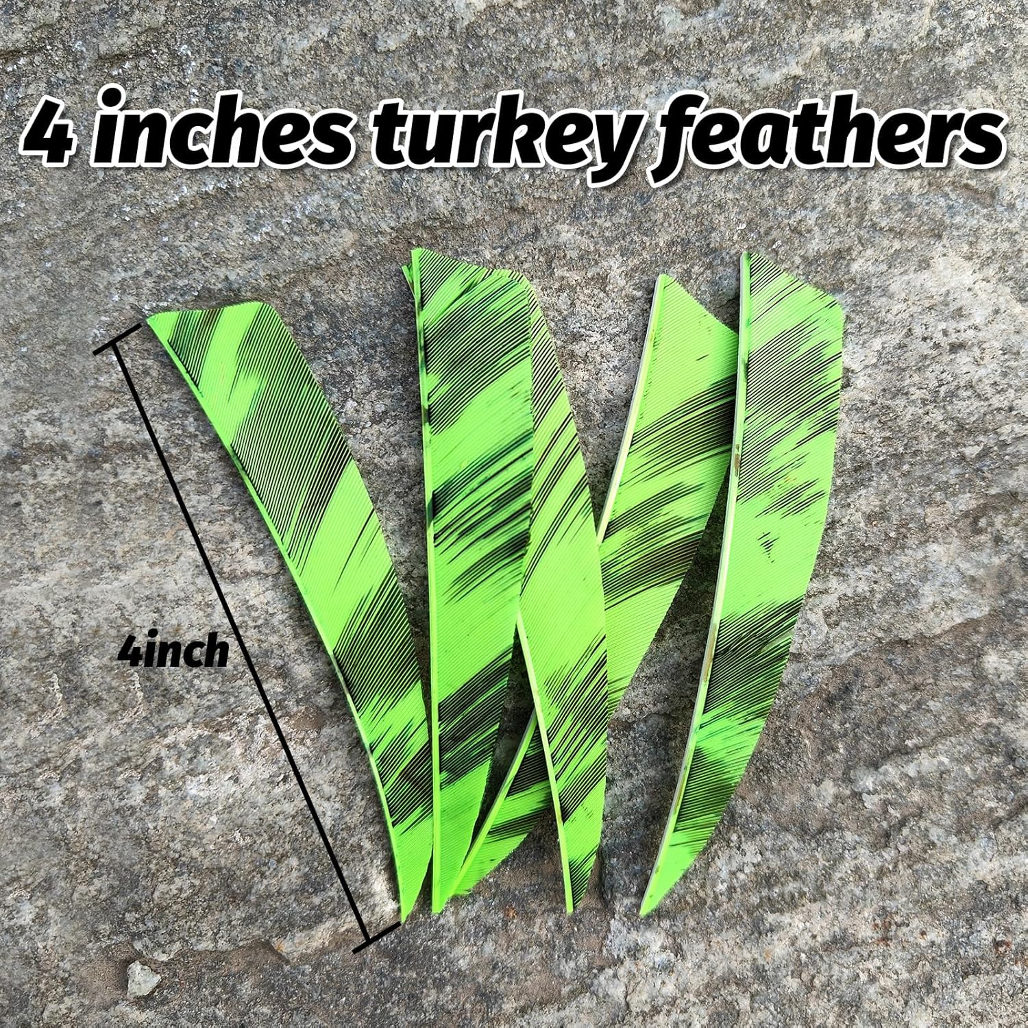 Length: 4 inches Material: Real turkey feather fletching Shape: Right wing shield cut Usage: Different kinds of arrows, such as carbon arrows, wood arrows, DIY arrows and so on Color: Red / Green