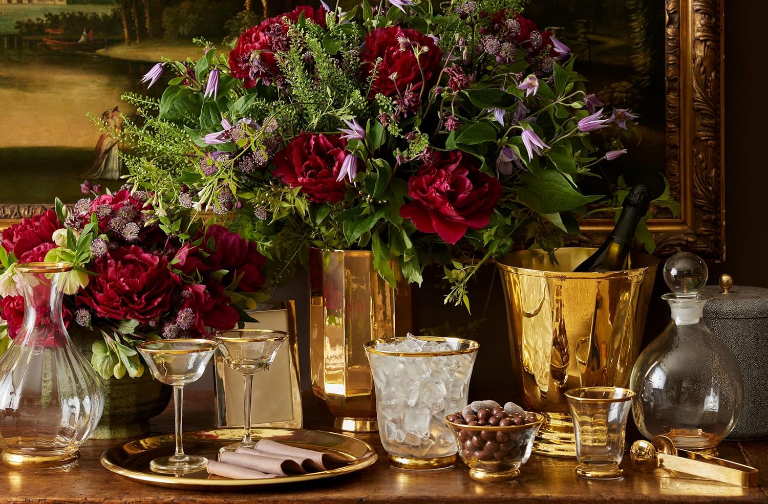 The Sophia Carafe is hand-blown in Italy and enhanced with hand-painted gold on the rim and base. The subtly fluted design gives it a vintage look that adds an elegant touch to a table when entertaining.