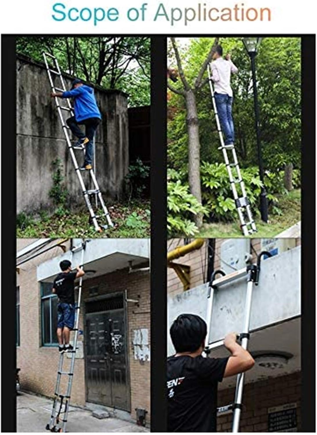 The clever new alternative to conventional ladders, the Telescopic Ladder has many applications both work and around the house.The ladder opens and closes "step by step", meaning that it can be used at multiple heights up to.The ladder is extremely compact in storage and transport therefore can easily fit into small spaces.It has rubber feet fitted to protect internal flooring and also give maximum safety.specification:Ladder type: extension ladderMaterial: aluminum alloysize:2.0m (6.5ft), 2.6m (8.5ft), 2.9m (9.5ft), 3.2m(10.5ft), 3.8m (12.4ft), 4.1m (13.4ft), 4.3m (14ft), 4.6m (15.1ft), 5.4m (17.7ft), 6.1m (20ft)Loading level: 150kgPackage Included:1 x Instruction Manual1 x Multi-Purpose Aluminum Extension Ladder