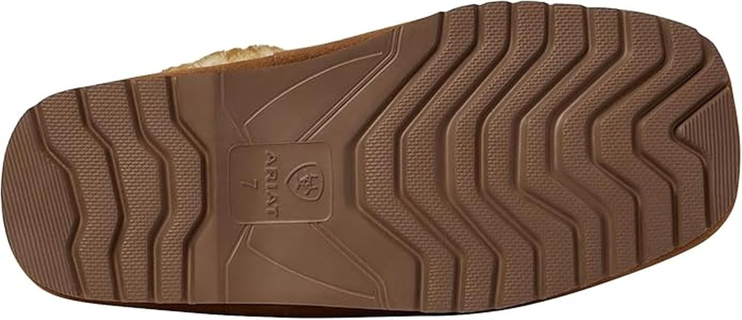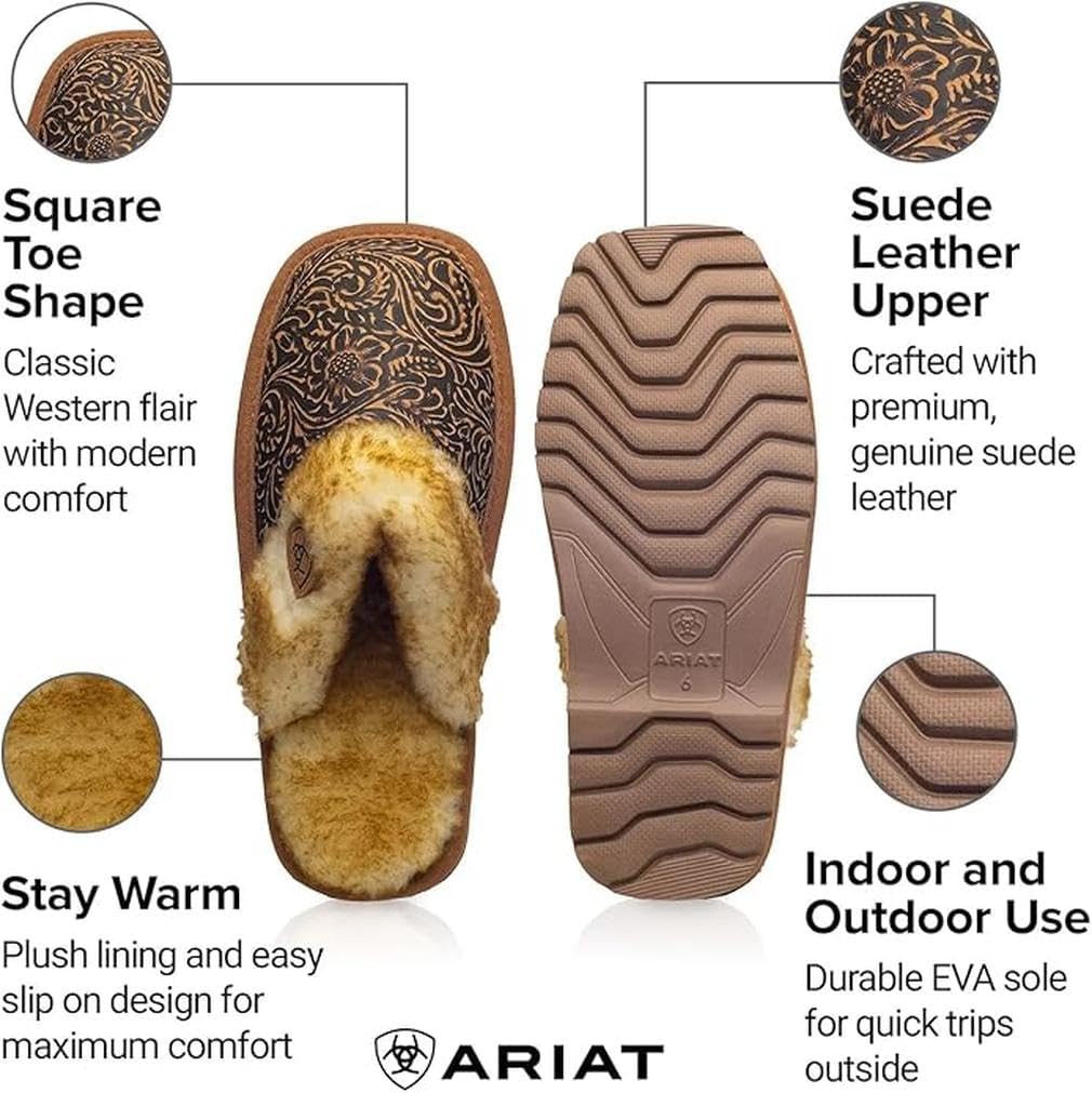 ARIAT WOMEN'S WARM SOFT COMFORTABLE INDOOR OUTDOOR GENUINE FULL-GRAIN LEATHER EMBOSSED TOOLING SLIPPERS Look forward to laid-back days in the cozy Ariat Jackie Exotic Embossed Tooling slippers. With an easy slip-on scuff design, these slippers offer effortless wear and convenience, allowing you to quickly slide your feet into these cozy slippers without any hassle. The practical design makes them an ideal choice for relaxed indoor wear, providing a hassle-free solution for your everyday comfort and leisure. The slippers are designed with soft midsole padding that delivers exceptional cushioning and support for long-lasting comfort throughout the day. The soft padding creates a plush underfoot feel, effectively absorbing impact and shocks, and ensuring a smooth and enjoyable walking experience. FEATURES: - Genuine Tooled, full-grain leather upper; - Warm, soft acrylic linings; - Easy slip-on scuff design; - Indoor/Outdoor EVA Outsole; - Soft midsole padding for all-day comfort. ARIAT'S SLIPPERS FOR LADIES Once the chores are done for the day, it's time to get cozy. Ariat's range of comfortable and stylish slippers offer something for everybody.Ariat is a leader in developing advanced technologies to deliver products that outperform in a variety of demanding environments.