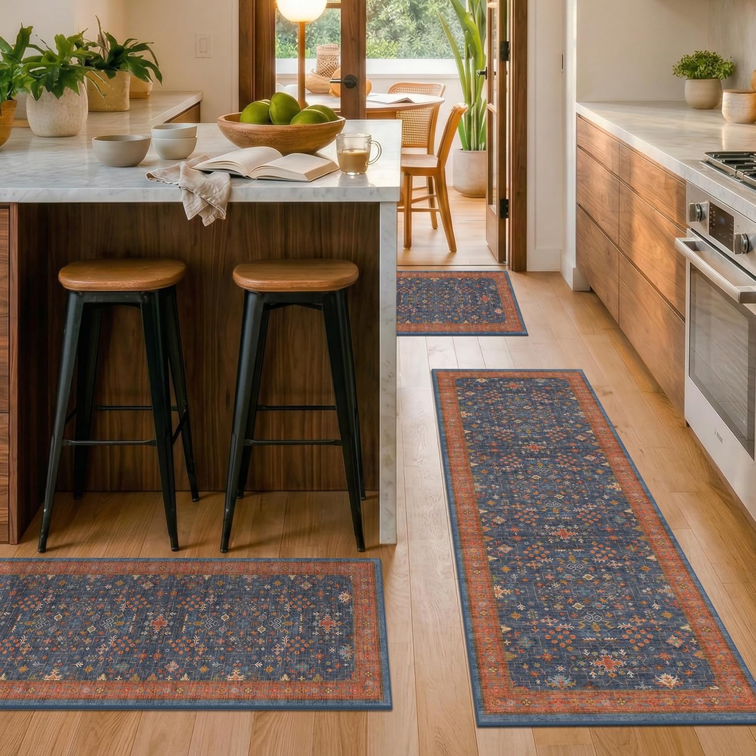 Bring comfort, style, and practical function to your kitchen with this 3-piece washable kitchen rug set. Designed with a soft low-pile surface and a reliable non-slip TPR backing, these rugs provide a smoother step while staying securely in place on tile, wood, or laminate flooring. Each piece is crafted from durable polyester that stands up to daily foot traffic and can be easily refreshed through machine washing, making it a convenient choice for busy households. The vintage-inspired distressed pattern adds warmth and character, blending naturally with modern, farmhouse, and traditional décor. Whether placed by the sink, along the stove, or in a long walkway, the coordinated sizes—20"x32", 20"x48", and 20"x59"—allow you to create a flexible layout that suits a variety of kitchen floor spaces. This kitchen rug set is designed to help maintain a cleaner, more comfortable kitchen environment while offering a timeless look that complements your home throughout everyday cooking and family routines.