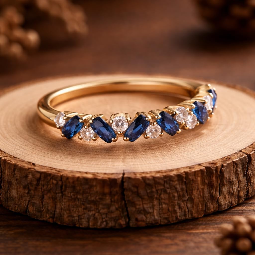 Celebrate timeless elegance with this exquisite Blue Sapphire and Diamond Half Eternity Band crafted in solid 14K yellow gold. The ring showcases alternating oval-cut blue sapphires and brilliant round diamonds, creating a captivating contrast of deep royal blue and radiant sparkle. Designed for both beauty and comfort, this stackable wedding band sits gracefully on the finger, making it perfect as an anniversary ring, promise ring, or a sophisticated everyday luxury piece. The half eternity setting offers brilliance across the top while ensuring comfortable wear throughout the day. Whether paired with an engagement ring or worn alone as a statement band, this sapphire and diamond ring embodies refined craftsmanship and meaningful symbolism. A stunning gift choice for anniversaries, weddings, or special occasions. Elegant. Timeless. Unforgettable.
