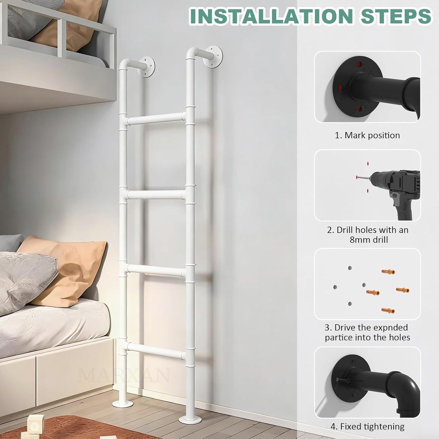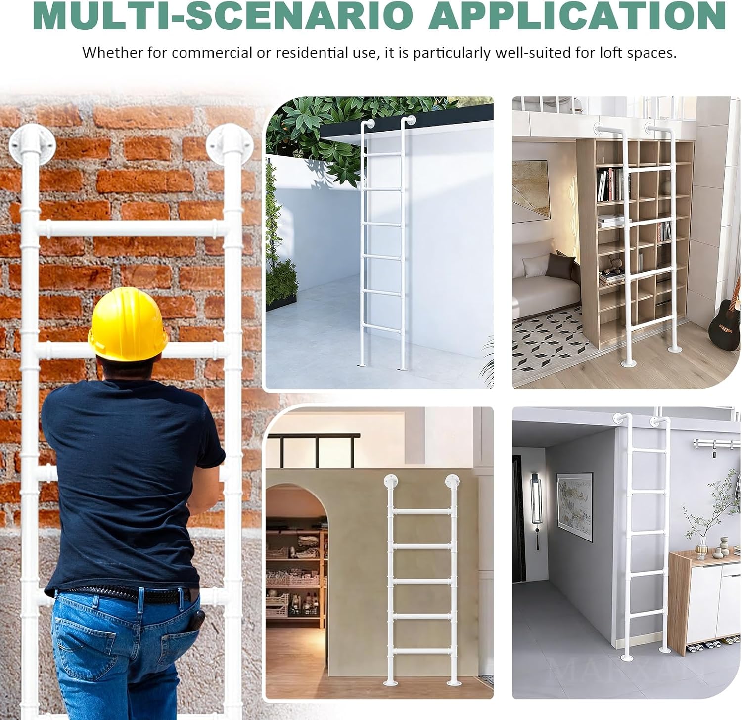 This metal wall-mounted ladder is suitable for various indoor and outdoor environments. Constructed from thickened galvanised metal tubing, it offers a robust and durable structure. Its vertical wall-mounted design saves floor space, allowing for easy installation even in confined areas. It is an ideal choice for basements, attics, bunk beds, dormitories, storage rooms, boats, garages, libraries, and window well escape routes.● Specifications:Material: Galvanised Metal TubingColour: WhiteLadder Height: 100–300cm/3.3ft–9.8ft (Customisable)Ladder Width: 45cm/17.7"Step Width: 38cm/15"Step Spacing: 25cm/9.8"Distance From Wall: 15cm/5.9"Tube Diameter: 3.2cm/1.26"Base Plate Diameter: 8.5cm/3.3"Load Capacity: 150kg/330lbs● Usage Notes:- Carefully measure the height and width of the installation location before purchasing.- Product dimensions are manually measured and may have a 1–3cm margin of error.- For routine cleaning, simply wipe the surface with a clean, soft cloth.We offer custom sizing; please inform us of any special requirements. Whether for domestic use or commercial spaces, this ladder will become your reliable companion for safe and convenient access!