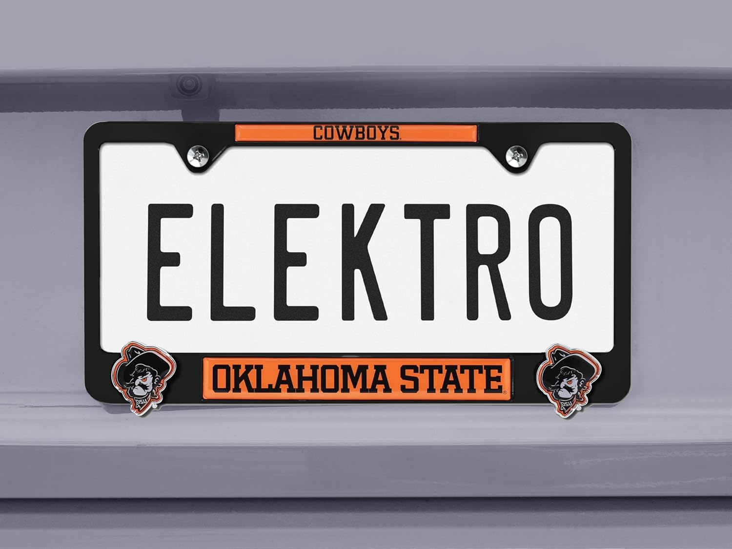 Officially licensed - Oklahoma State Cowboys black 3D license plate frame by Elektroplate. All-metal (NOT plastic) frame with a matte black finish, striking 3D mascot logo graphics, and full color UV-protected domed inserts that are Made in the USA.