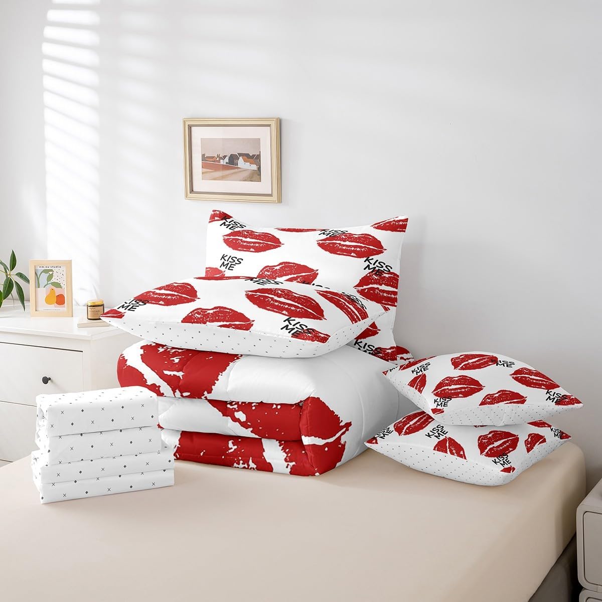 Colorful Makeover to Your Life Various size and color options, there are always decor room. Size Options: 7 Pieces Twin Size,1 Down Comforter 68"x 90", 1 Fitted Sheet 39"x75"x16", 1 Flat Sheet 96"x66", 2 Pillow Cases 30" x 20",2 Throw Pillow Covers,Covers Only. 18"x 18". 7 Pieces Full Size ,1 Down Comforter 79"x 90", 1 Fitted Sheet 54"x75"x16", 1 Flat Sheet 96"x81", 2 Pillow Cases 30" x 20",2 Throw Pillow Covers,Covers Only. 18"x 18". 7 Pieces Queen Size,1 Down Comforter 90"x 90", 1 Fitted Sheet 60"x80"x16", 1 Flat Sheet 102"x90", 2 Pillow Cases 30" x 20",2 Throw Pillow Covers,Covers Only. 18"x 18". 7 Pieces King Size,1 Down Comforter 104"x 90", 1 Fitted Sheet 78"x80"x16", 1 Flat Sheet 106"x90", 2 Pillow Cases 30" x 20",2 Throw Pillow Covers,Covers Only. 18"x 18". Decoration: For your mom, dad, sister, brother, grandma, wife, husband, and all other beloved with many surprising designs. You can find a design for everybody and every interest in our collection. Your Home,You Decide Different types of bedding sets could bring rooms in different styles. Also, rooms in different styles needs different types of bedding sets