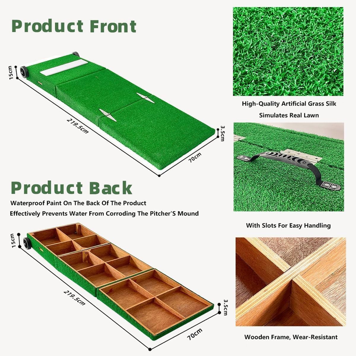 High Quality Material: The pitching mound is made of thickened plywood which is stable and ensuring long-lasting use. High-strength EVA material for regulation pitching rubber,heavy duty and weather resistant,Ideal for baseball leagues Wide Application: The portable pitching mound is suitable for use in gym floors, grass floors, playgrounds, etc. Whether you're a beginner or a seasoned pitcher, this mound is designed to support your training needs with reliability and consistency, making it an essential tool for enhancing your pitching skills over time Features: EVA bottom, strong bearing capacity Unbreakable and durable Specifications: Name: Portable Baseball Pitching Mound Color:Green Triple Folding Pitcher Mound - Wheeled Model Product size approx: 219.5x70x15cm Weight: 24.83kg Packing size: 80x76x41cm Weight:28.17kg Package list: 1 * Foldable Baseball Pitchers Mound