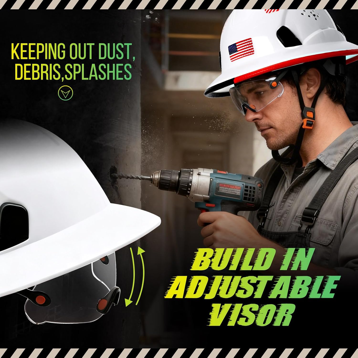 | Included Components | 1 Clear Visor Mounted On Hardhat, 1 Pack Refletive USA Flag Hard Hat Stickers, 1pc White Full Brim Hard Hats For Men Women |