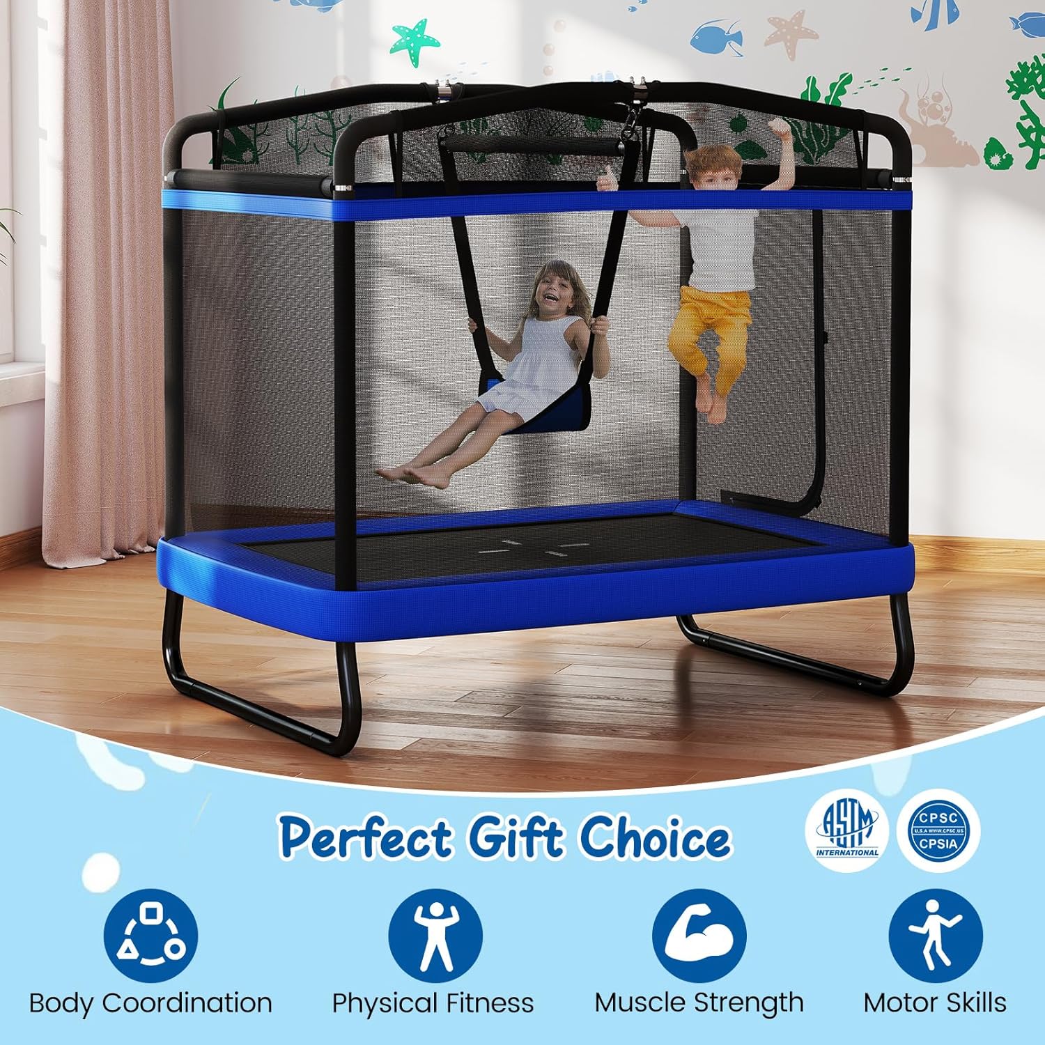 Description:Elevate your child’s playtime with our 6 x 4 ft rectangle kids trampoline!Equipped with a detachable swing and horizontal bar, the backyard trampoline enriches playtime by offering various activities that enhance motor skills. Its elastic PP jumping mat and 32 high-tensile springs ensure dynamic bounce quality. The no-gap design, combined with a padded spring cover, enhances safety, while the hot-dip galvanized frame and spray-painted U-shaped legs contribute to solid stability and lasting durability. To further prioritize children’s safety, the outdoor indoor trampoline features an anti-collision foam cover and secure enclosure net with a zippered entry. Suitable for both outdoor and indoor settings,this rebounder trampoline promises to keep your children active, entertained, and safe.Features:Provides trampoline, swing, and horizontal bar for versatile play optionsHigh-elastic PP jumping mat and 32 pcs strong springs for high bounce performanceNo-gap design with 8 row stitching for extra securityTightly sewn jumping mat and padded spring cover for added safetySpray-painted U-shaped legs for unmatched stability and durabilityChild-friendly details including anti-collision foam cover and safety enclosure netThe horizontal bar and swing are detachable with high-strength carabinersComfortable swing seat for hours of enjoymentZippered entry with buckles for easy accessPromotes body coordination, physical fitness, muscle strength, and motor skillsPerfect gift choice for children 3+ years oldComplies with ASTM/CPSIA for peace of mindAssembly is required before useSpecifications:Color: Blue/PinkMaterial: Galvanized Steel + PE + PP + PVC + EPEOverall Dimension: 70” x 48” x 67”/ 177 x 122 x 170 cm (L x W x H)Jumping Mat Dimension: 56” x 33”/ 143 x 84 cmWall Thickness of Steel Poles: 1.5 mmStatic Weight Weight of Trampoline: 660 lbs/ 300 kgDynamic Weight Capacity of Trampoline: 132 lbs/ 60 kgWeight Capacity of Swing: 100 lbs/ 45 kgWeight Capacity of Horizontal Bar: 100 lbs/ 45 kgSuitable Age: 3+ Years OldNet Weight: 58 lbs/ 26.5 kgPackage Includes:1 x Kids Trampoline1 x Swing1 x User Guide