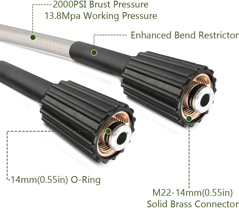 Specification: Name: Pressure Washer Hose Burst Pressure: 2000PSI Working Pressure: 13.8Mpa Max. Temperature: 60℃ / 140℉ Hose Length: 5m / 16.4ft, 6m / 19.69ft, 8m / 26.25ft(Optional) Package Included: 1 * Pressure Washer Hose