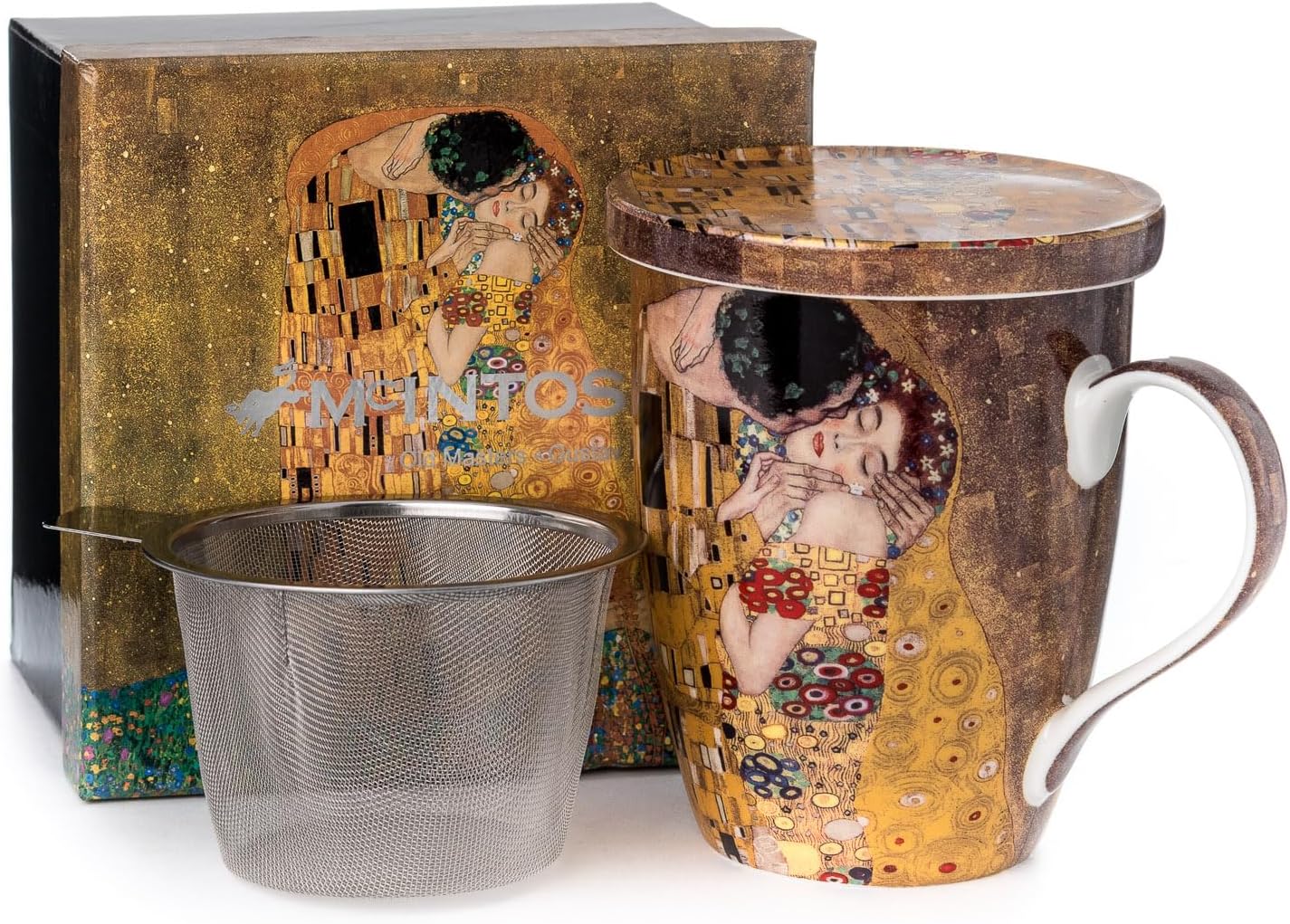 Who says a good tea mug has to be clunky? Using a tea mug can be very convenient and practical if you only want to make a single cup of tea instead of brewing a full pot. A good quality tea mug can also makes the cup of tea taste better. This tea mug is made of fine bone china - beautiful, strong, elegant and good quality. It is also functional, light weight on hand and easy to clean. It comes with a good tea infuser, the holes of the tea strainer are small enough so that the tea leaves will not fall right through, while the infuser is deep allowing tea to steep properly. What's more, this mug has a tapered bottom. The lid can be use as a coaster or as a tea caddy. This product features with the painting of "The Kiss" by Old Master artist - Gustav Klimt. Gustav Klimt (1862-1918) -- Merging images of the metaphysical and erotic, Klimt is a leading artist of the Art Nouveau era. In paintings from his Golden Period, Klimt ventures beyond iconographic images to art that exceeds spatial and temporal constraints.