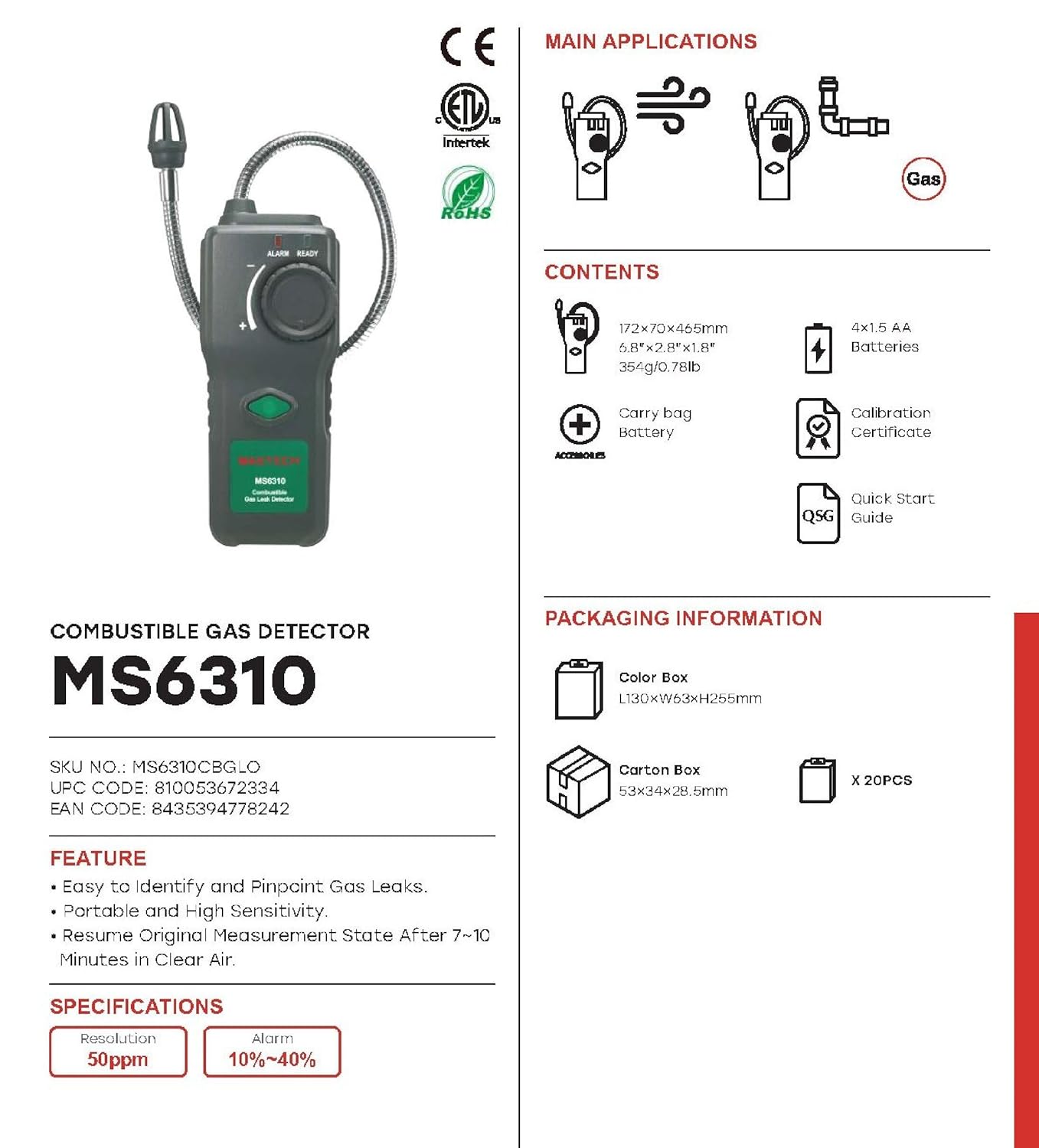 MGL MASTECH MS6310 Portable Combustible Gas Freon Leak Detector Natural Gas Propane Gas Analyzer With Sound Light Alarm Multi-functions Environment Tester(MS6310)