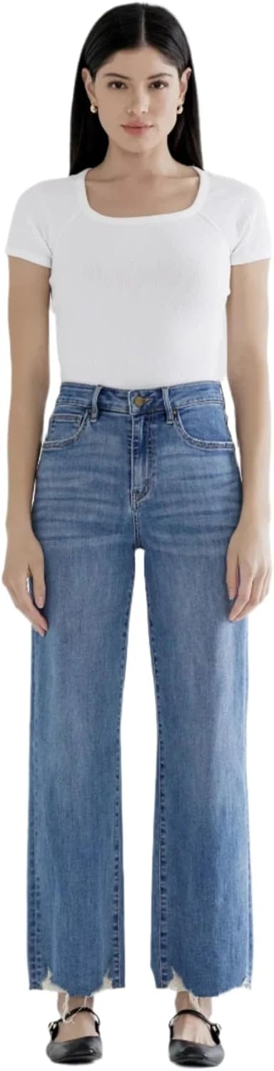 HIGH RISE WIDE LEG W HEM DETAILFABRIC: 90.5% COTTON, 7% POLY, 2.5% SPANMEASUREMENT:FRONT RISE: 10 3/4", INSEAM: 28"