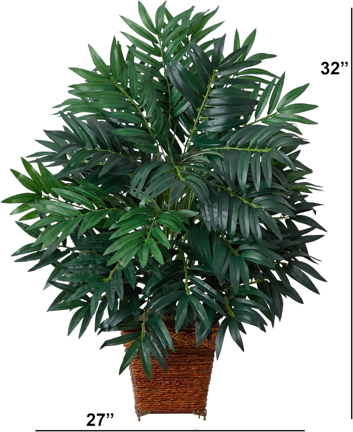 Re-create the feelings of a warm summer night anytime of year with this exotic bamboo palm. Wispy, lush leaves are the secret to this tropical sensation, which stands a full 32 inches tall. In fact, this lofty bamboo plant is sure to catch the eye of all who gaze upon it. Best of all, this carefree silk plant will thrive even on cloudy days. A bold wood wicker basket further enhances the splendor of this extravagant beauty.