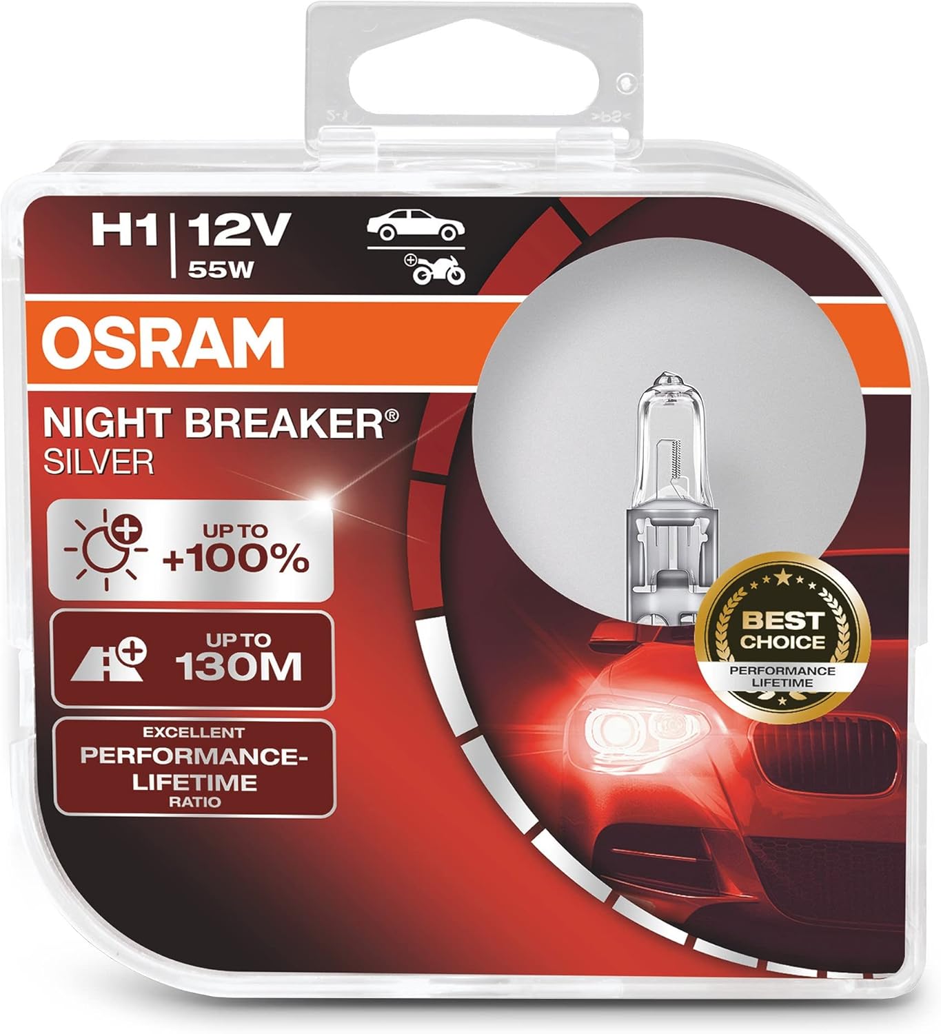 Osram Night Breaker Silver H11: the Osram Performance halogen car lamp with excellent service life. Bright light, powerful and optimised longevity Osram Night Breaker Silver is the perfect choice for riders with high demands on performance and service life. With up to 100% more brightness and a 130 m long beam of light (compared to the legal minimum requirements), drivers recognise traffic signs, obstacles and dangers earlier than with conventional halogen headlight bulbs. Night Breaker Silver: Bright halogen headlight bulb with convincing price-performance ratio. Take advantage of brighter light on the road, especially noticeable when driving in the fog, on dark roads or at dusk. More brightness can help you see better and makes it possible for you to be seen better by others. In addition, these car lights impress with their value for money. The car lamps comply with ECE standard and are approved for road traffic. Osram Night Breaker Silver impresses with its modern design with an attractive silver dome for H4, H7 and H11 bulbs. Trust the number one - just like many international car manufacturers Osram is the world market leader in vehicle lamps. Every year, half of all cars manufactured worldwide are equipped with our light sources. Our customers include some of the largest international automotive companies. In short, with Osram you can rely on lighting solutions that meet ever higher safety requirements and impress with the highest Osram quality and performance standards. Convincing at a glance: Up to 100% more brightness (compared to the legal minimum standard). Up to 130 m long beam of light (compared to the legal minimum standard). Premium quality, made in Germany. ECE approved. Available as H1, H4, H7, H11. Box contents: 2 lamps (duo box). Technical information: Order number: 64211NBS-HCB. ECE: H11. Voltage: 12V Nominal NL HCPower: 55 W Base: PGJ19-2.