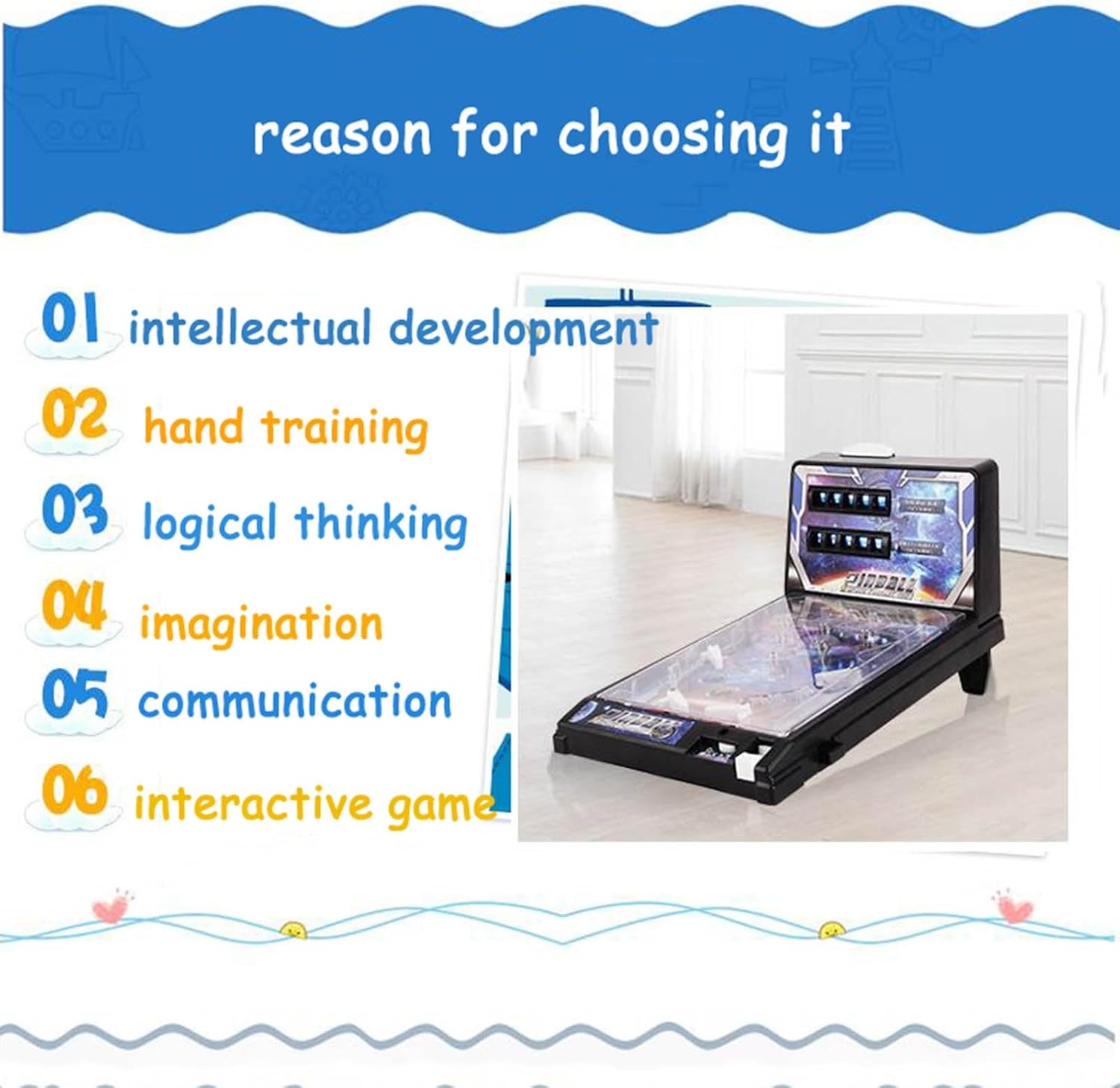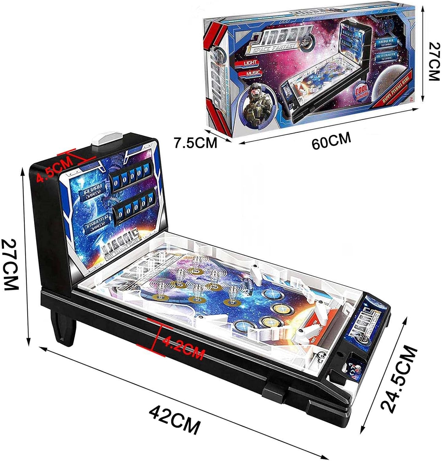 This new type of casual desktop interactive game can enhance feelings, not only move body, but also move eyes, which can relax visual nerves and reduce chance of Preschooler's myopiaProduct SpecificationProduct Name: Tabletop arcade gameMaterials: Upgrade plasticPackage Size: 60x7.5x27cmProduct Size: 42x27x24.5cmProduct Weight: 1600gPackage Weight: 2000gPacking: Pinball Game Machine x 1How to use: Pull pinball ejector on bottom right to make pinball enter panel of game machine, press pinball controllers on both sides to control pinball to hit spring in middle of game machine, if it hits spring, game machine will make a sound and Lights, and counted into score, otherwise, pinball machine will not emit lights and sounds, and will not be counted into score