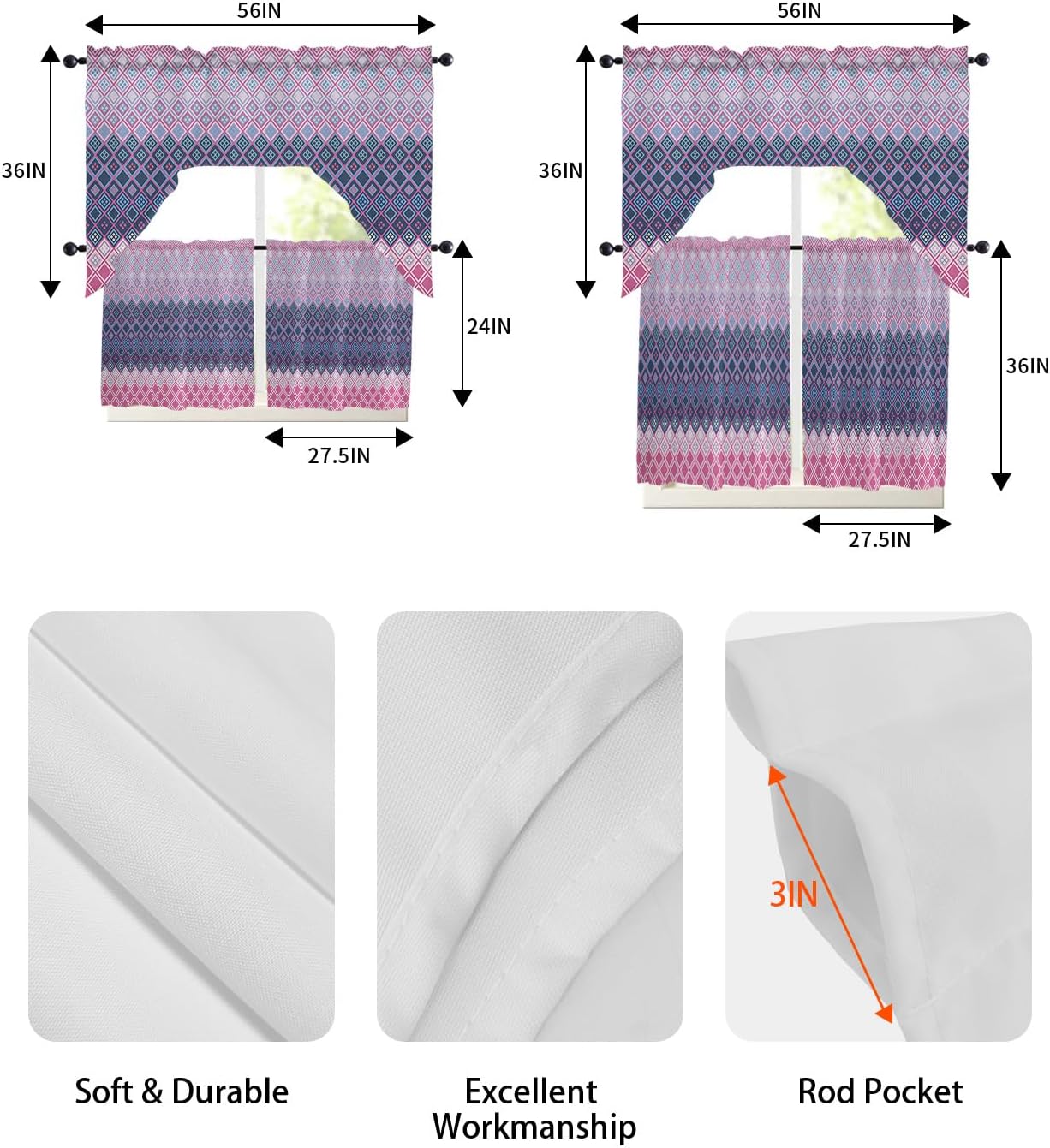 Widely Used: Our universal swag and tier curtain set is highly recommended by many customers as home decoration items.Beautiful and practical rideaux de chambre decoration are not only used in kitchens, bedrooms, dining rooms, living rooms, bathrooms, but also match other occasions, such as home office, laundry room, kids room, nursery, balcony, classroom, pet room, guest room, playroom, study room, washroom, coffee shop, cafe shop and more.Ideal Gift: Are you still worried about what gift to give for Christmas, Halloween, Thanksgiving, Independence Day, Mother's Day, Father's Day, Housewarming, Valentine's Day, St. Patrick, Easter, New Year? Why not take a look at our charming kitchen cafe curtain set, classic designs perfect for gifting to family, friends, colleagues and neighbours, etc.Various Styles: Our window drapery can perfectly match the style of your home.We have retro pastoral style, country farmhouse style, simple modern style, European aristocratic style, romantic French style, etc.Optional Colors: Bright colors are an important part of kitchen curtains sets for windows clearance.We have black, white, grey, red, brown, silver, beige for adults and pink, green, orange, blue, yellow, rainbow, multi-color for kids.Tip: Due to everyone uses different light or monitors, there may be a slight error in the color of the window curtain panels. Don't affect the beauty and use of the product.Just rod pocket curtains, no rods.