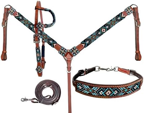 This colorful set features medium leather with a Southwest style beaded overlay with black, turquoise, and white beads. This tack set is accented with silver conchos with black & turquoise beads as well as on the buckles. Included is a single ear headstall, breast collar, wither strap, and contest reins. Features: 100% Leather Beautiful Southwest Beaded Overlay Sized for an Average Full Size Horse