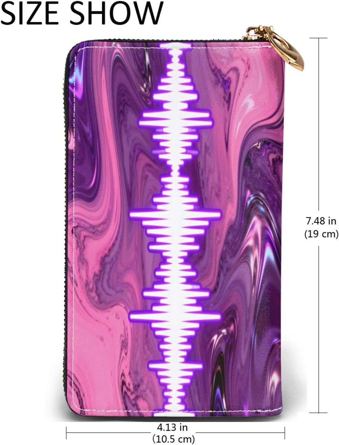 sound waves ck of rummaging through a chaotic bag for cards and cash? Meet our Long Zip-Around Wallet for Women the ultimate organizer that looks as good as it works. Designed for the modern woman who refuses to choose between style and sanity, this wallet tames your essentials into one sleek, secure package. We've covered all bases: 12 card slots (goodbye, crumpled receipts!), multiple bill compartments, a zippered coin purse, and even a spot for your checkbook. No more 'where did I put my debit card?' panic attacks everything has a home. The full zip-around closure acts like a tiny vault, keeping your stuff safe while you're out conquering the day. And that robust metal zipper? Built to last longer than your New Year's resolutions, so it glides smoothly for years. The wallet's advanced microfiber leather is a triple threat: soft as a cloud, eye-catching with double-sided prints, and tough enough to handle spills, scratches, and life's little messes. Eco-friendly, too because looking good shouldn't cost the Earth. Practicality meets beauty in its slim profile, which slips easily into your tote or handbag. But wait, there's more! The attached wrist strap turns it into a chic clutch perfect for date nights or quick coffee runs when you'd rather not lug a giant bag. Need a gift that's both thoughtful and actually useful? This wallet's got you. With top-tier function, luxe materials, and a design that turns heads, it's a present they'll use (and love) every single day.