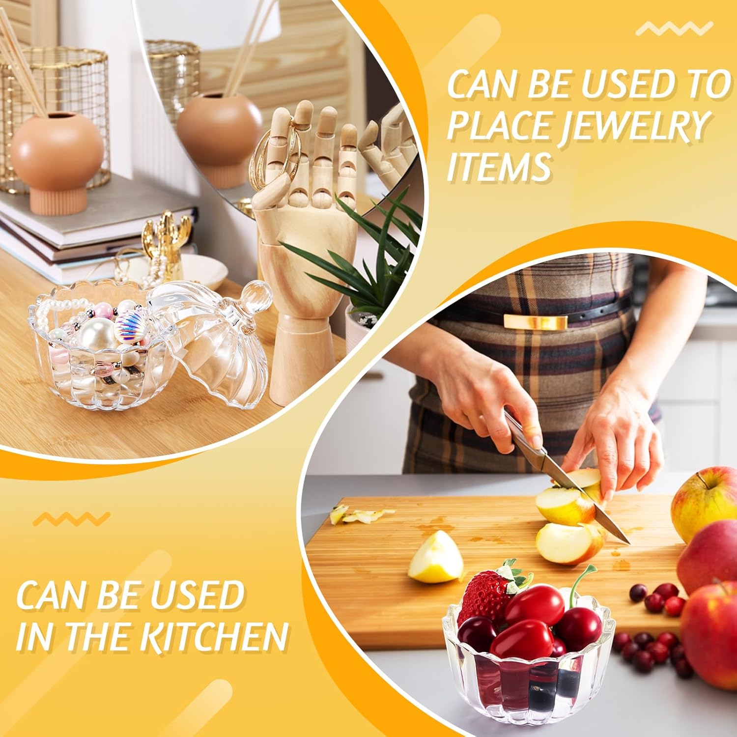 Features: Lovely home decoration: These glass candy jars can be placed in your home for decorations, such as kitchen, bedroom, bathroom, living room, garden and more, impressing your guests when they first arrive. Easy to carry: Each crystal candy dish can be easily stored in your bags for outdoor activities like camping and picnic. Specifications: Main material: glass Color: as shown in the picture Package includes: 16 x Wedding candy buffet jars Notes: Manual measurement, please allow slight errors on size. The color may exist a slight difference due to different screen displays. Fragile products are included, please handle the glass with care, ensure that children use them under the supervision of adults