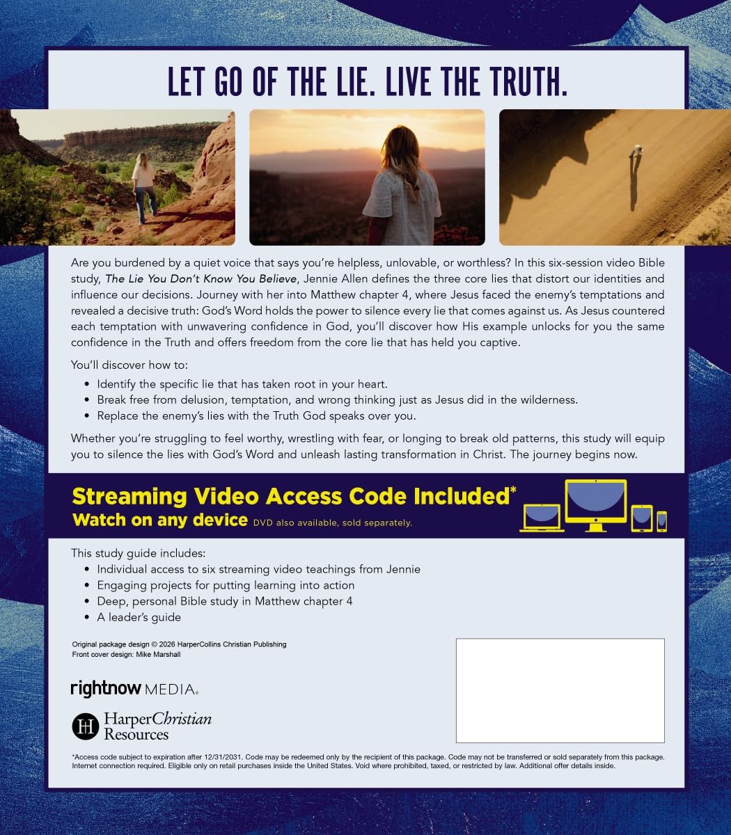 Let go of the lie. Live the truth.Are you burdened by a quiet voice that says you’re helpless, unlovable, or worthless? In this six-session video Bible study, The Lie You Don’t Know You Believe, Jennie Allen defines the three core lies that distort our identities and influence our decisions. Journey with her into Matthew chapter 4, where Jesus faced the enemy’s temptations and revealed a decisive truth: God’s Word holds the power to silence every lie that comes against us. As Jesus countered each temptation with unwavering confidence in God, you’ll discover how His example unlocks for you the same confidence in the Truth and offers freedom from the core lie that has held you captive.You’ll discover how to:Identify the specific lie that has taken root in your heart.Break free from delusion, temptation, and wrong thinking just as Jesus did in the wilderness.Replace the enemy’s lies with the Truth God speaks over you.Whether you’re struggling to feel worthy, wrestling with fear, or longing to break old patterns, this study will equip you to silence the lies with God’s Word and unleash lasting transformation in Christ. The journey begins now.This study guide includes:Individual access to six streaming video teachings from JennieEngaging projects for putting learning into actionDeep, personal Bible study in Matthew chapter 4A leader’s guideStreaming video access included. Access code subject to expiration after 12/31/2031. Code may be redeemed only by the recipient of this package. Code may not be transferred or sold separately from this package. Internet connection required. Void where prohibited, taxed, or restricted by law. Additional offer details inside. Read more