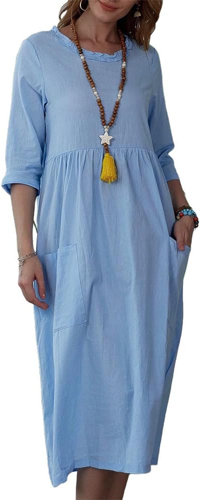TBILILO Womens Summer Cotton Linen Midi Dresses Casual 3/4 Sleeve Ruffled Crewneck Flowy A-line Dress with Pockets