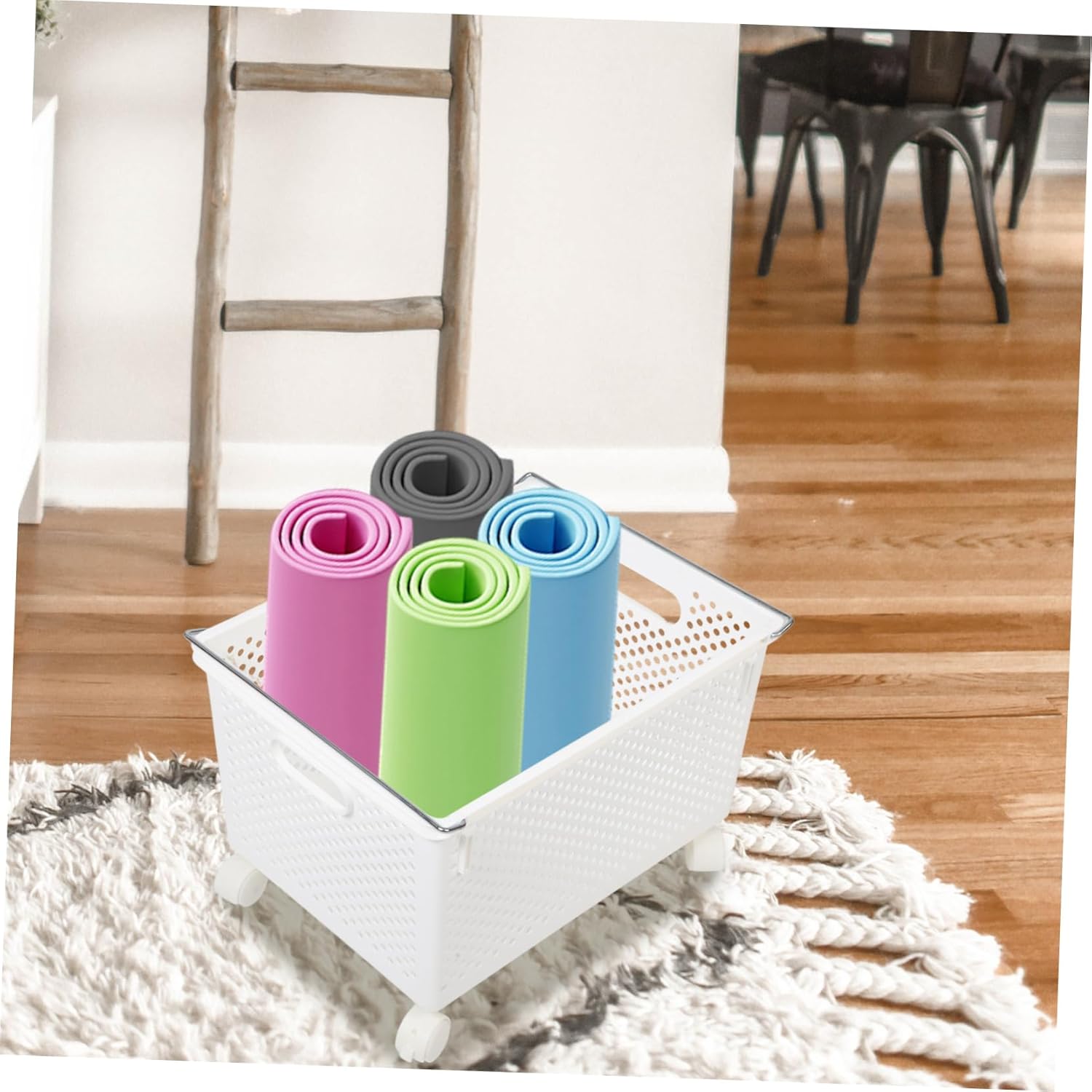 Package Include 1 x storage basket Characteristics -Color:White -Material:PlasticGoods InformationThis yoga storage basket is designed to support fitness enthusiasts looking to keep their workout essentials neatly arranged and easily accessible. Made from durable plastic with a hollow pattern, it provides ventilation and maintains freshness for stored items. Its spacious interior accommodates multiple types of fitness equipment such as foam rollers, kettlebells, dumbbells, and yoga mats. The basket's sturdy build supports up to 10 kilograms, ensuring that heavier items remain safely stored without deformation. The elegant white finish complements any workout environment, adding a clean and modern touch. A dedicated basketball rack within the design offers secure storage for basketballs, preventing them from rolling away or cluttering the space. This versatile gym equipment container serves as a practical organizer for various sports gear, making it a helpful addition to home gyms, fitness studios, or recreational areas. By keeping your exercise equipment organized, this basket helps create a motivating and welcoming workout space that encourages consistent fitness habits From Parliky was founded to bring order and elegance to active lifestyles through thoughtfully designed fitness storage solutions. We focus on combining durable materials with practical designs to enhance workout spaces and simplify equipment management. Our fitness baskets embody these values by supporting diverse fitness routines and inspiring users to maintain organized, motivating environments. Experience fitness organization with Parliky, function